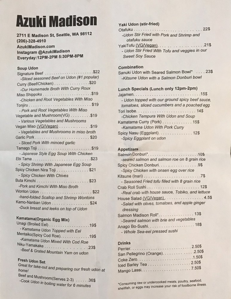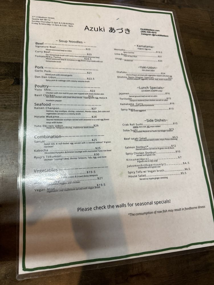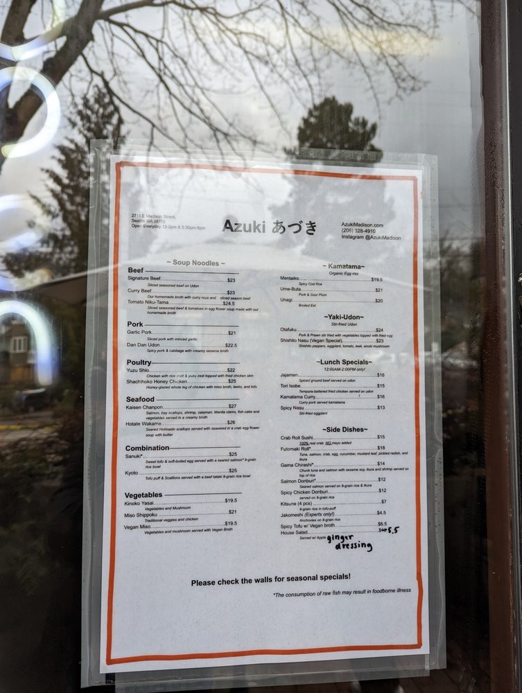 Located in the charming neighborhood of Madison Valley, Azuki offers an impressive selection of Japanese noodle dishes that promise to delight your palate. Specializing in both traditional favorites and unique creations, this cozy eatery is perfect for casual dining.